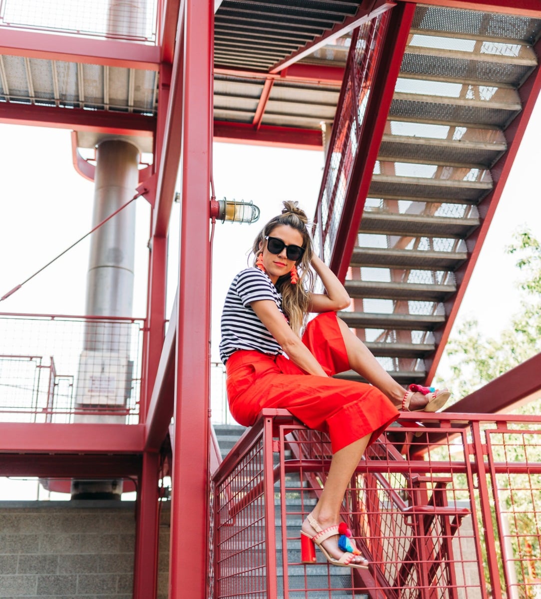 It’s a common joke in the house that when I get passionate about things I get really animated, move my hands around a lot, or raise my voice (when I’m not even mad). Or when we argue (yes we argue haha and it’s usually over really dumb things), Cody always teases me that I can get feisty and attributes it to my ‘spicy latin blood’ (I’m half Colombian – so when I saw this shirt I had to get it and it looks even better in person. I love the intersection of a graphic tee with embellishment – how good are these tassels! I definitely haven’t been shying away from bright colors lately. I love these bold red Kate Spade pants and they are actually really versatile! I’ve already worn them multiple times. And the statement bow totally makes them unique and a statement piece. And of course the shoes! I never shy away from pom poms!! Obsessed with these sandals!
